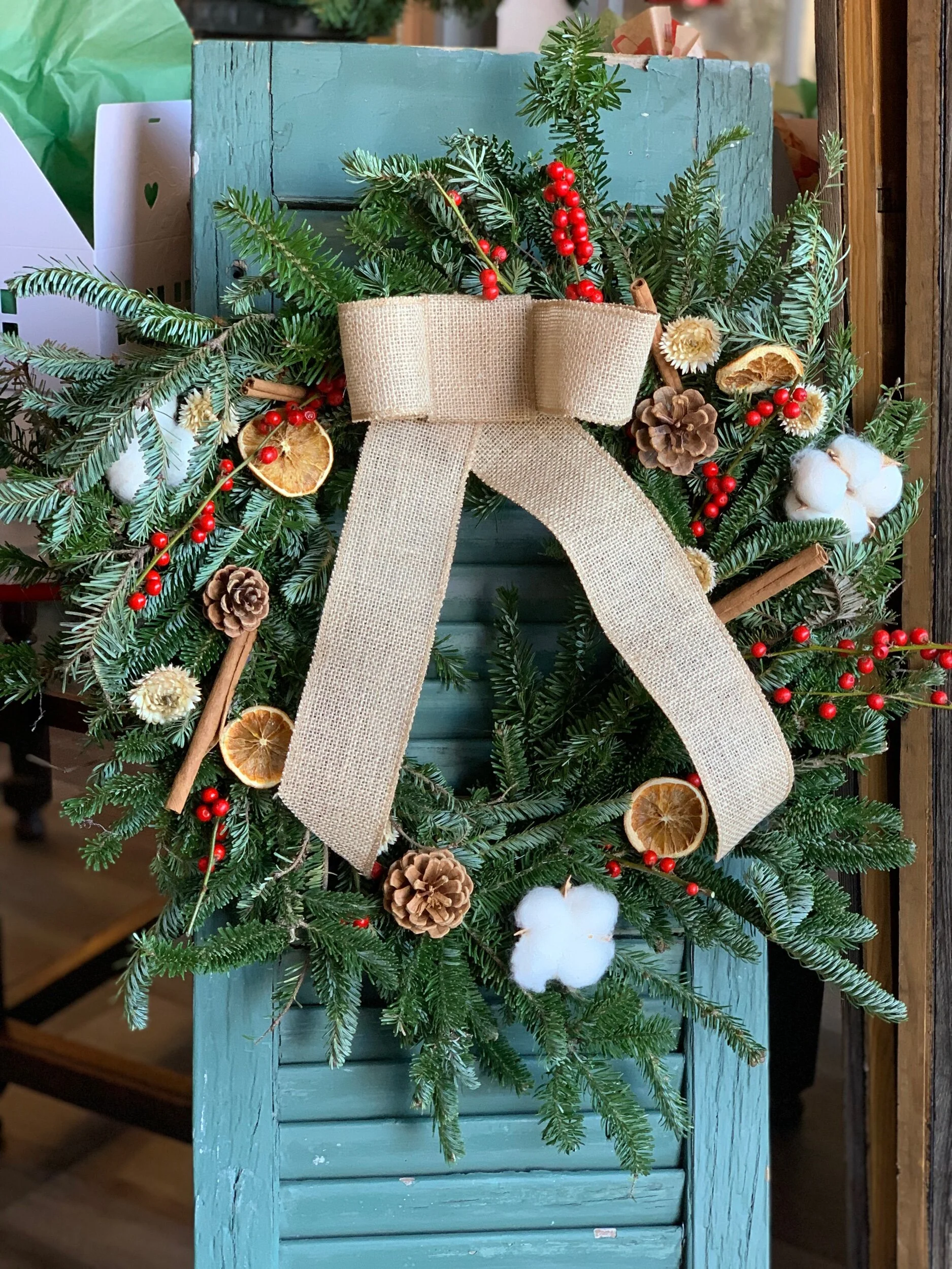 Creating beautiful holiday wreathes is one or our specialities. We use a fresh evergreen wreath and design a lovely holiday wreath for your home.